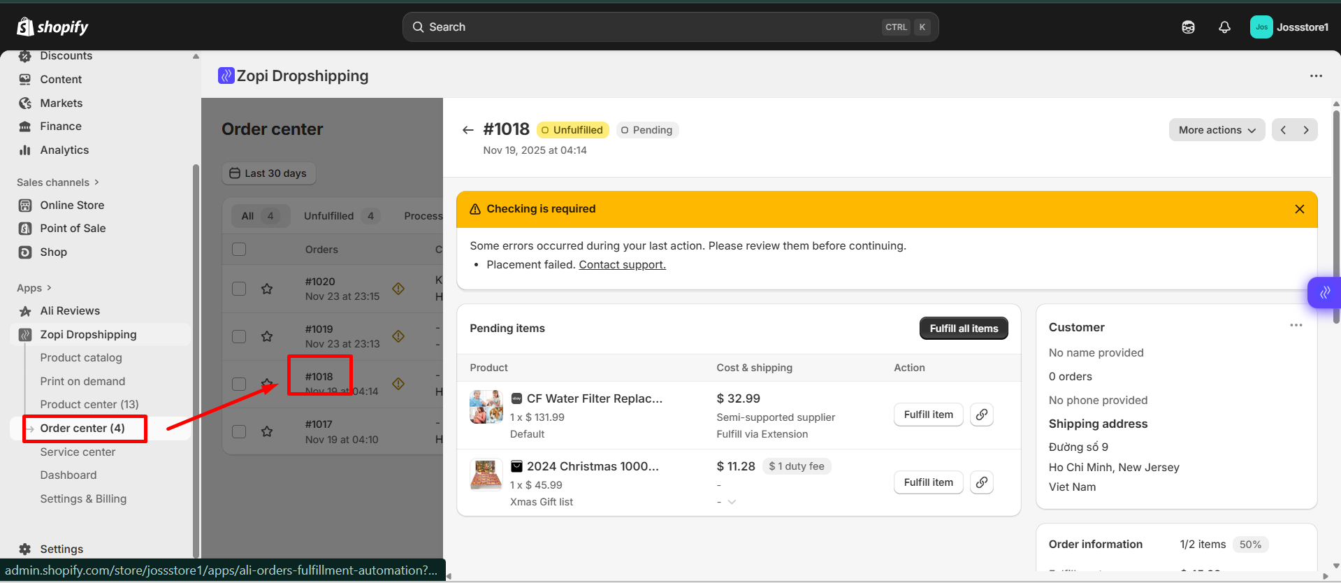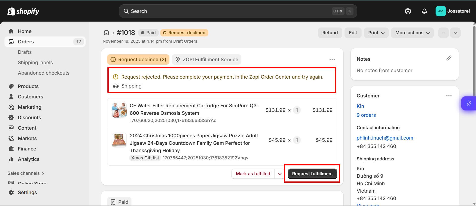 If you see the message “Request rejected. Please complete your payment in the Zopi Order Center and try again.”, this means the order could not be fulfilled because it was triggered incorrectly from Shopify instead of Zopi. This error is common among new dropshippers who are still learning how automated fulfillment works.