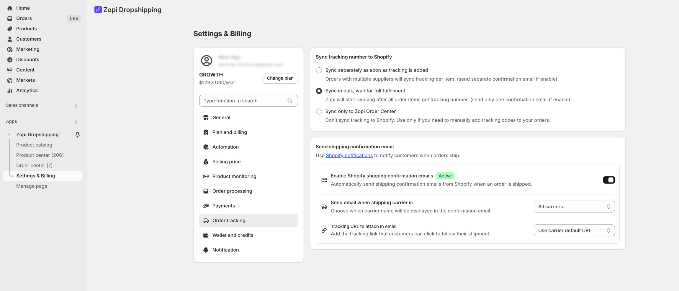 In Zopi’s Order Tracking settings, you can decide whether Shopify should automatically send a shipping confirmation email each time Zopi syncs a tracking number. This setting acts as a bridge, allowing you to control email notifications to your customers.