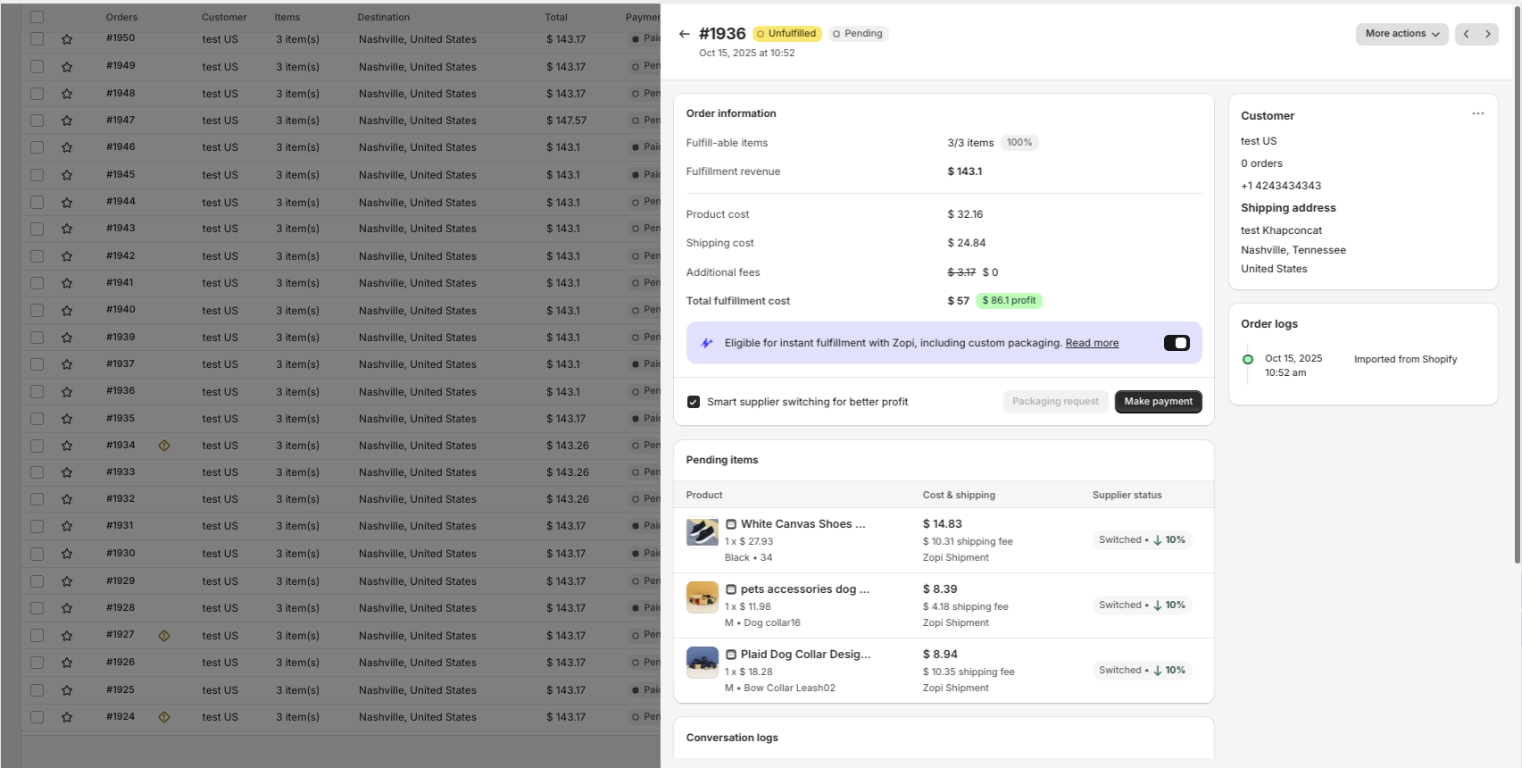 Instant Fulfillment is available when Zopi identifies a better supplier option for your orders — helping you fulfill faster and earn higher profit.
