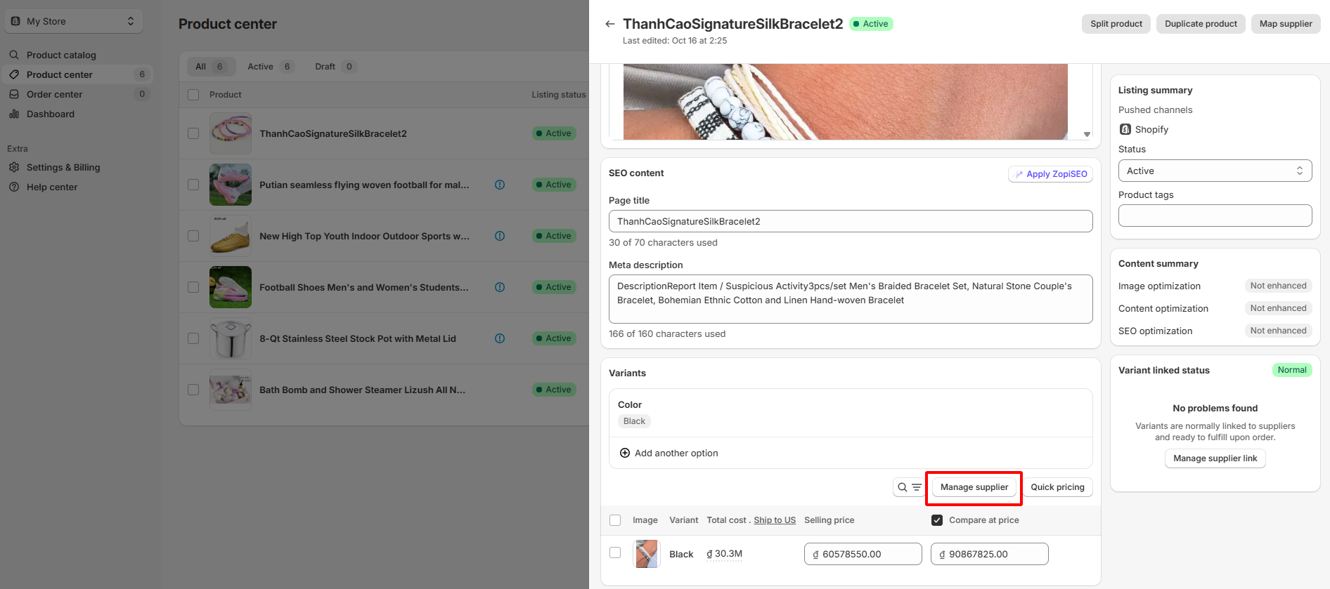 3. In the details window, scroll down to “Manage Supplier” — where you can add or update a supplier link to map the product in Zopi.