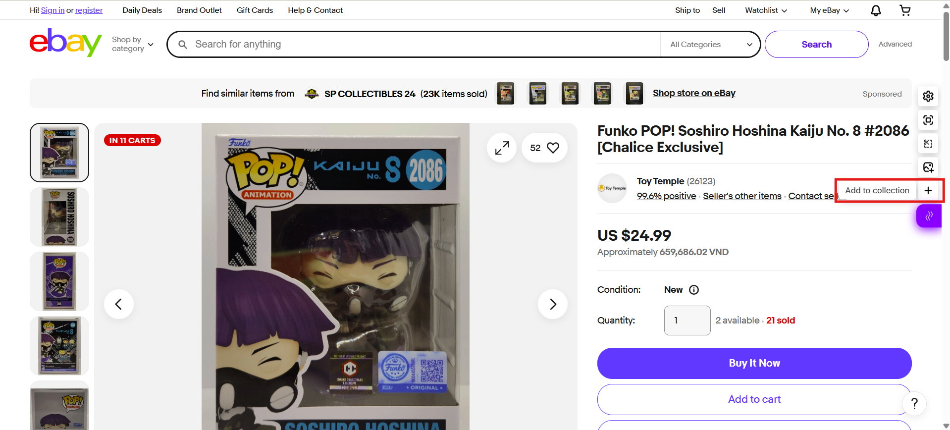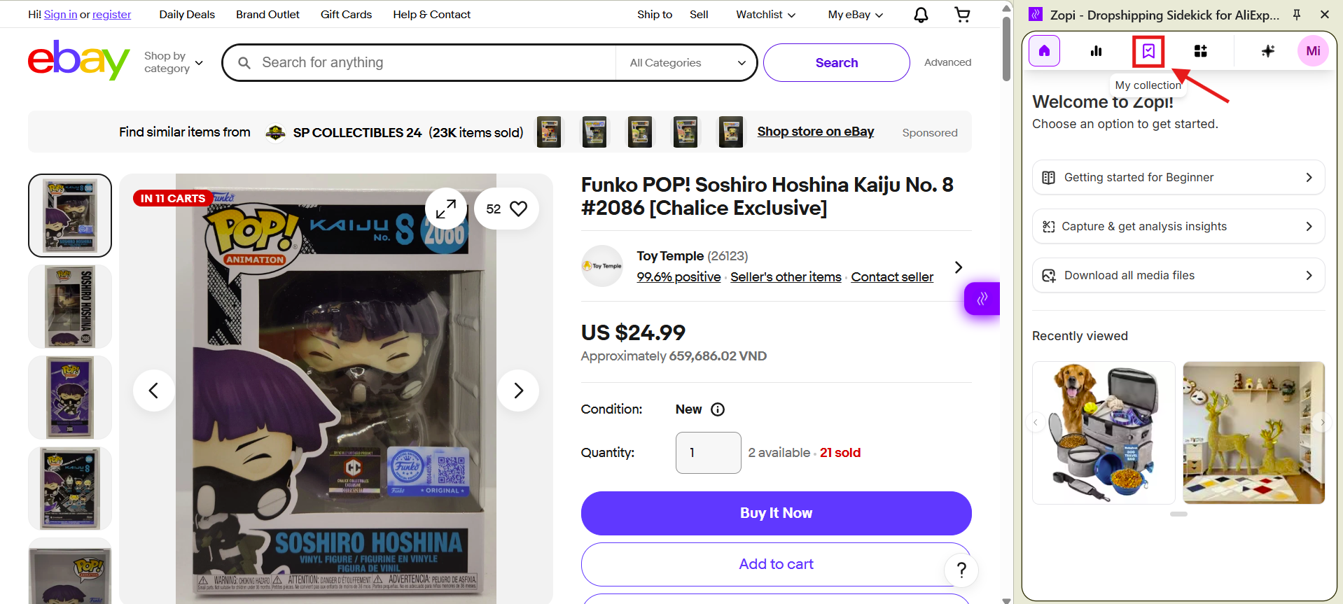 - Hover over the purple Zopi icon on the right side of your browser and click the Add to Collection icon.