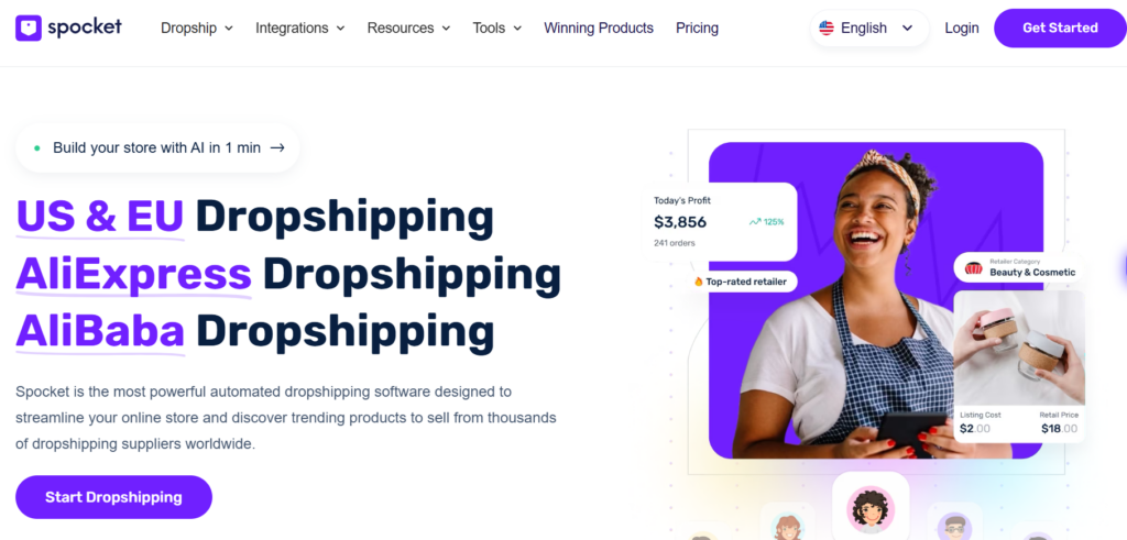 Pricing: Spocket offers a free trial, with paid plans starting at $24/month.